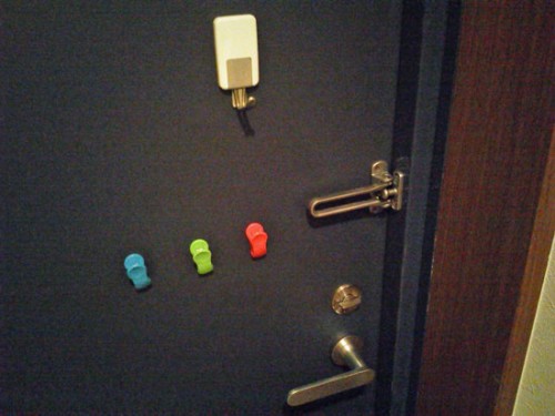 こんな風に玄関のドアにマグネットクリップとマグネットフックをとりつけるだけです。